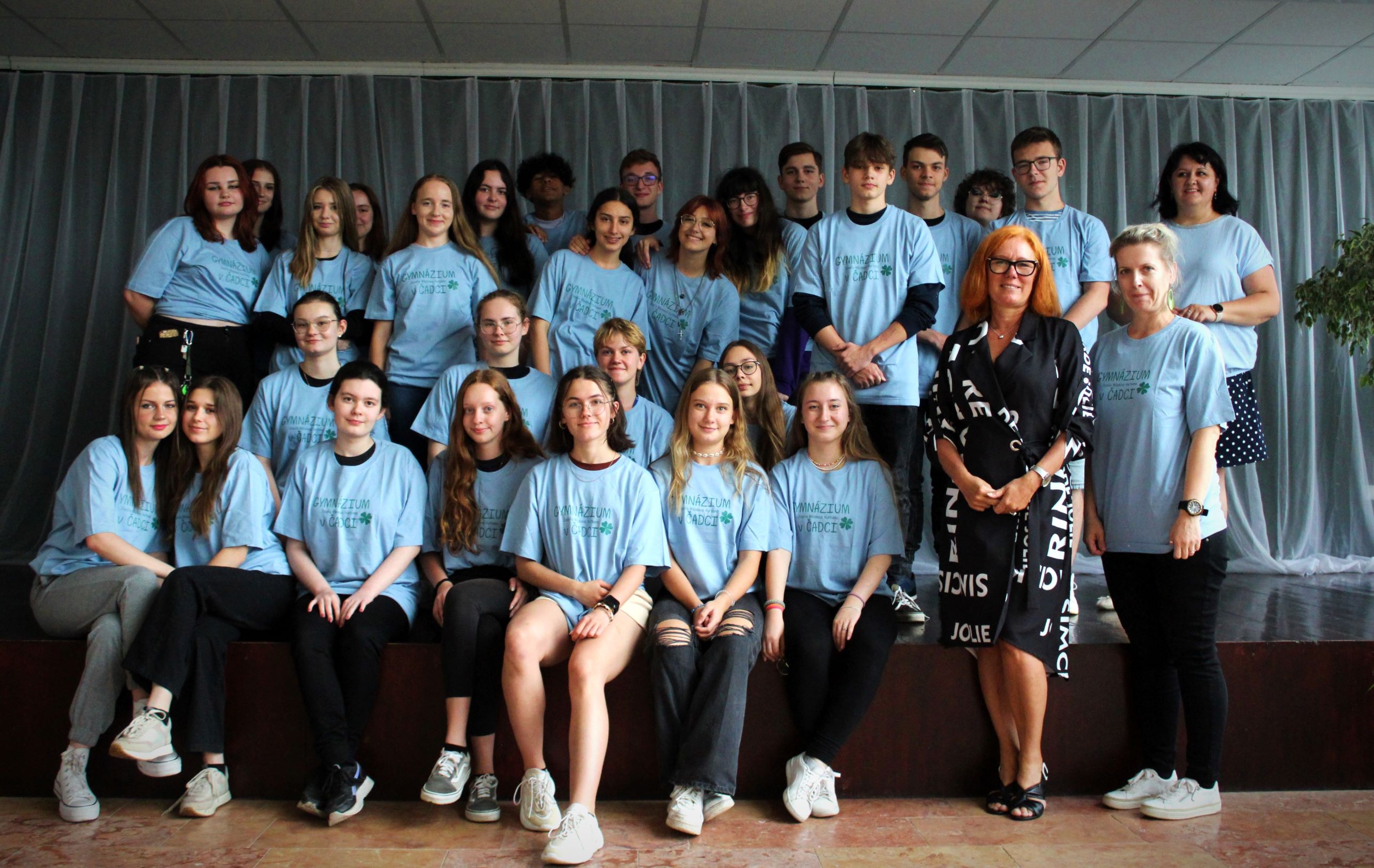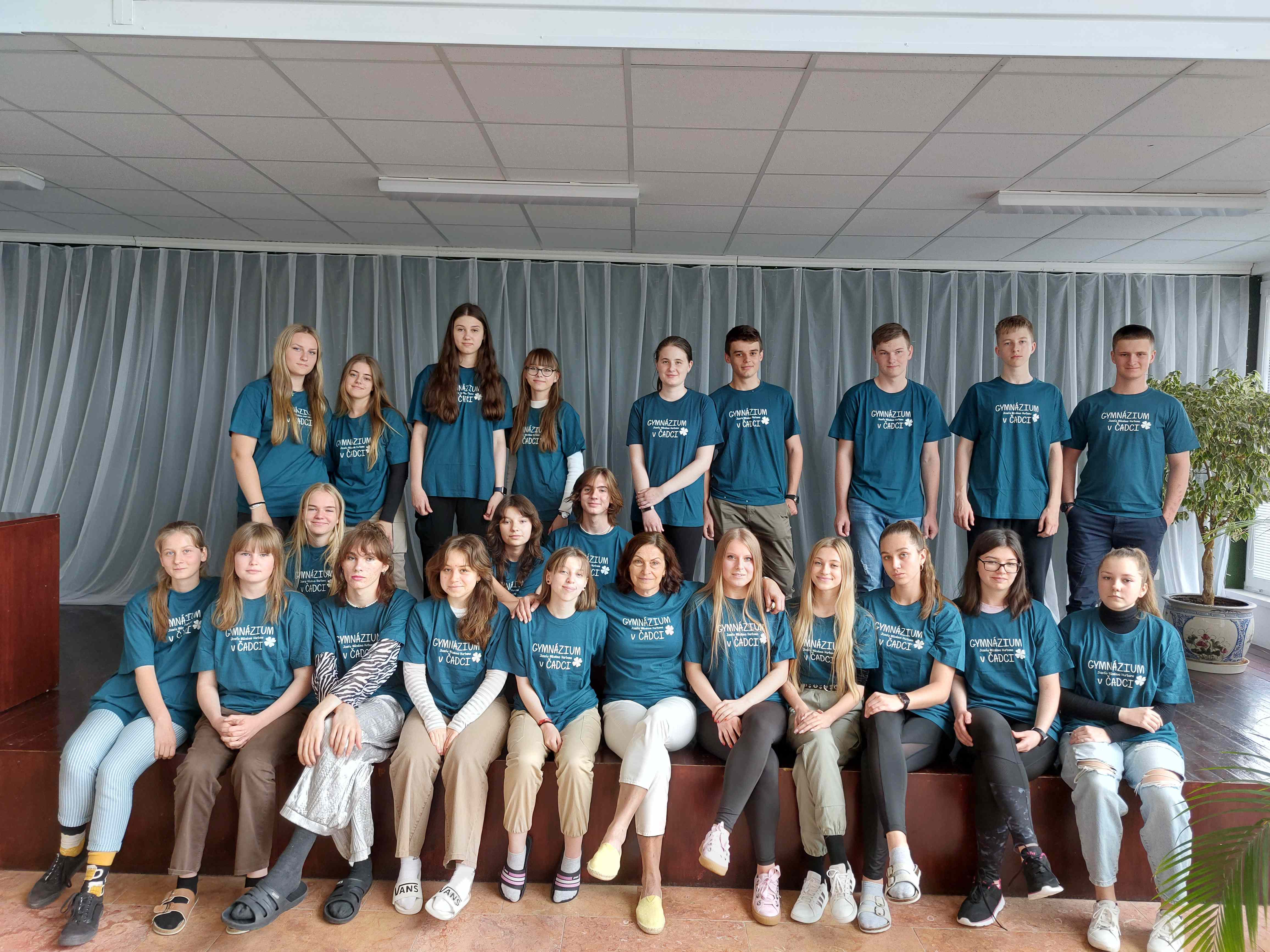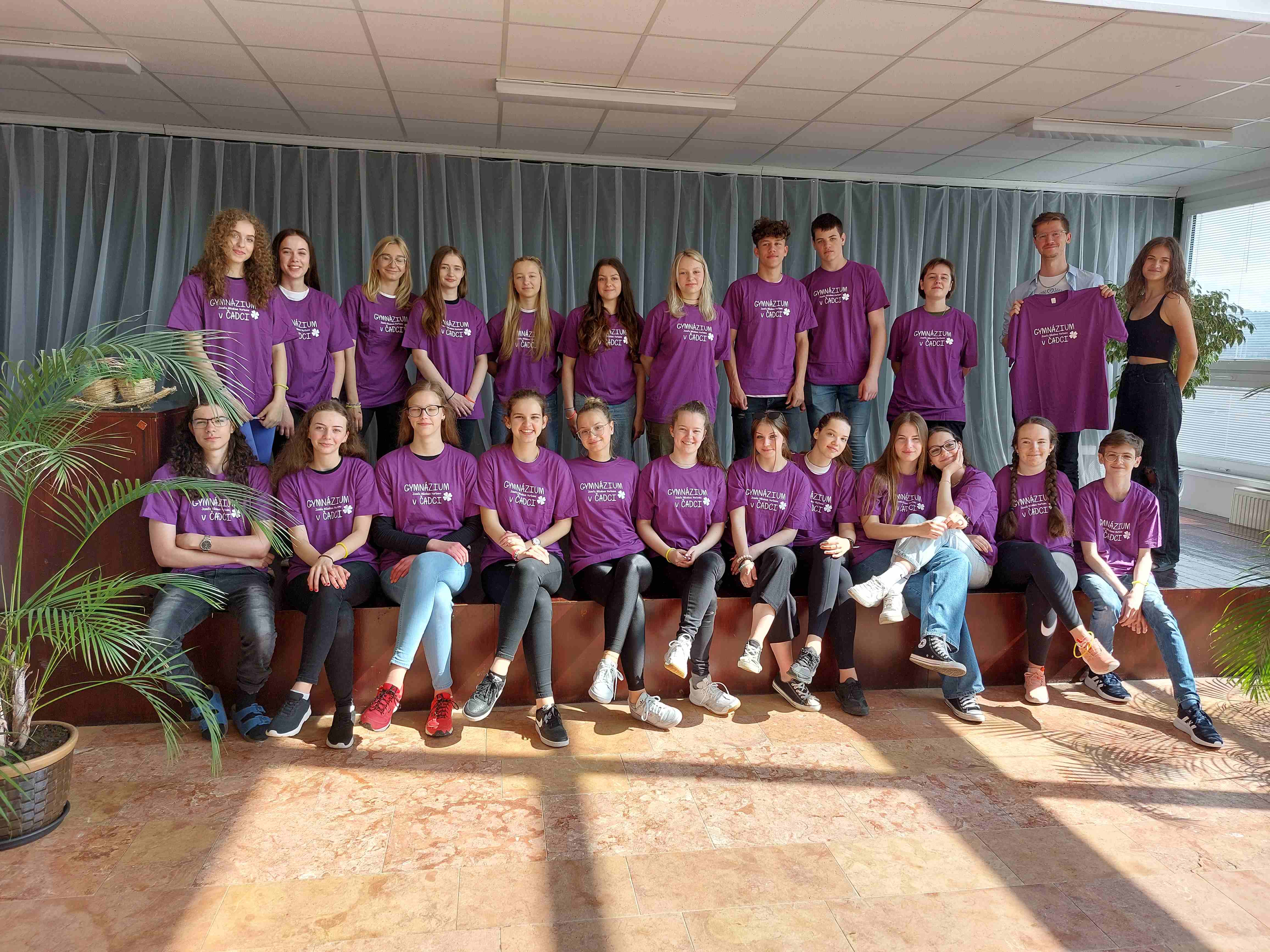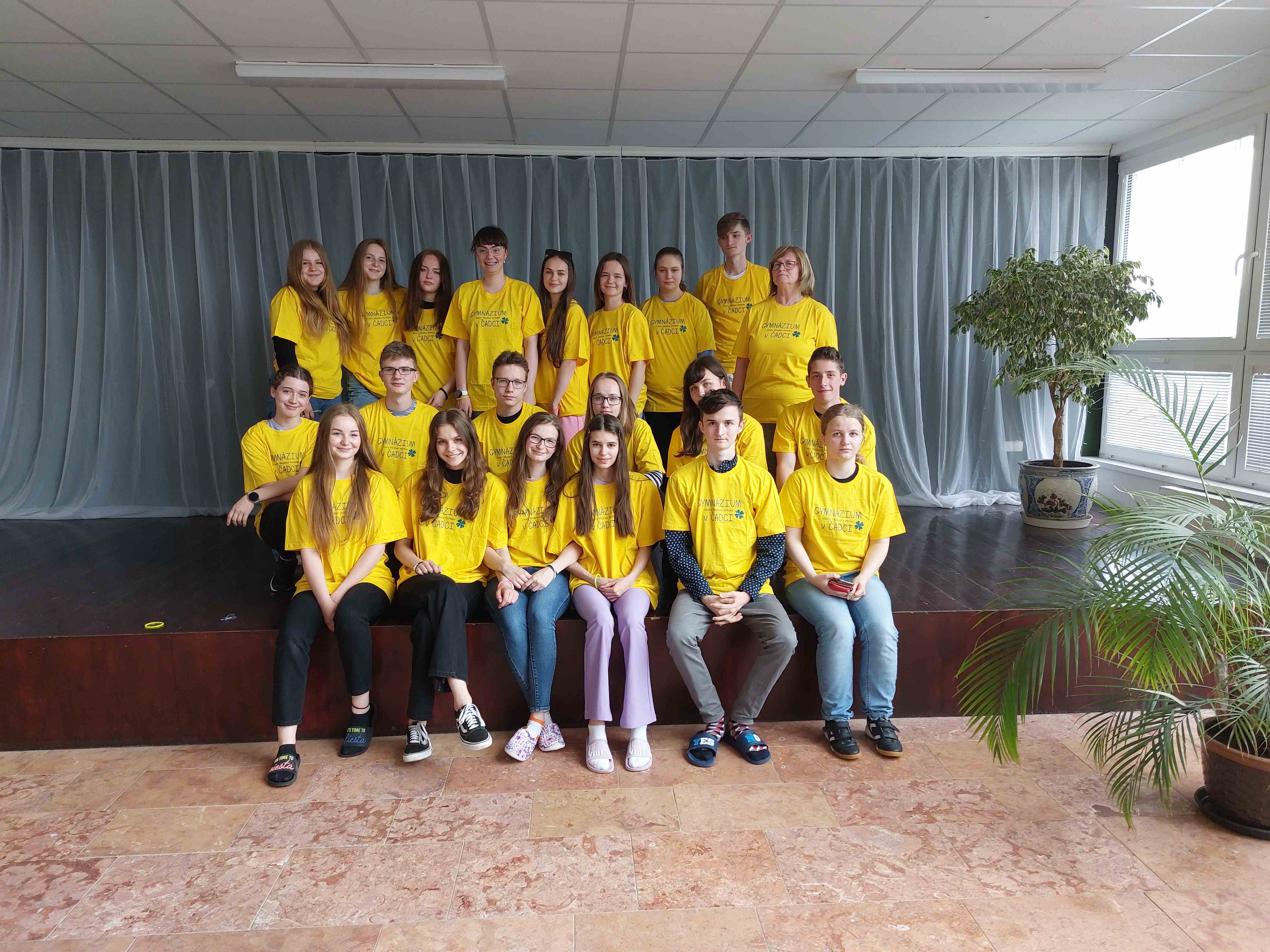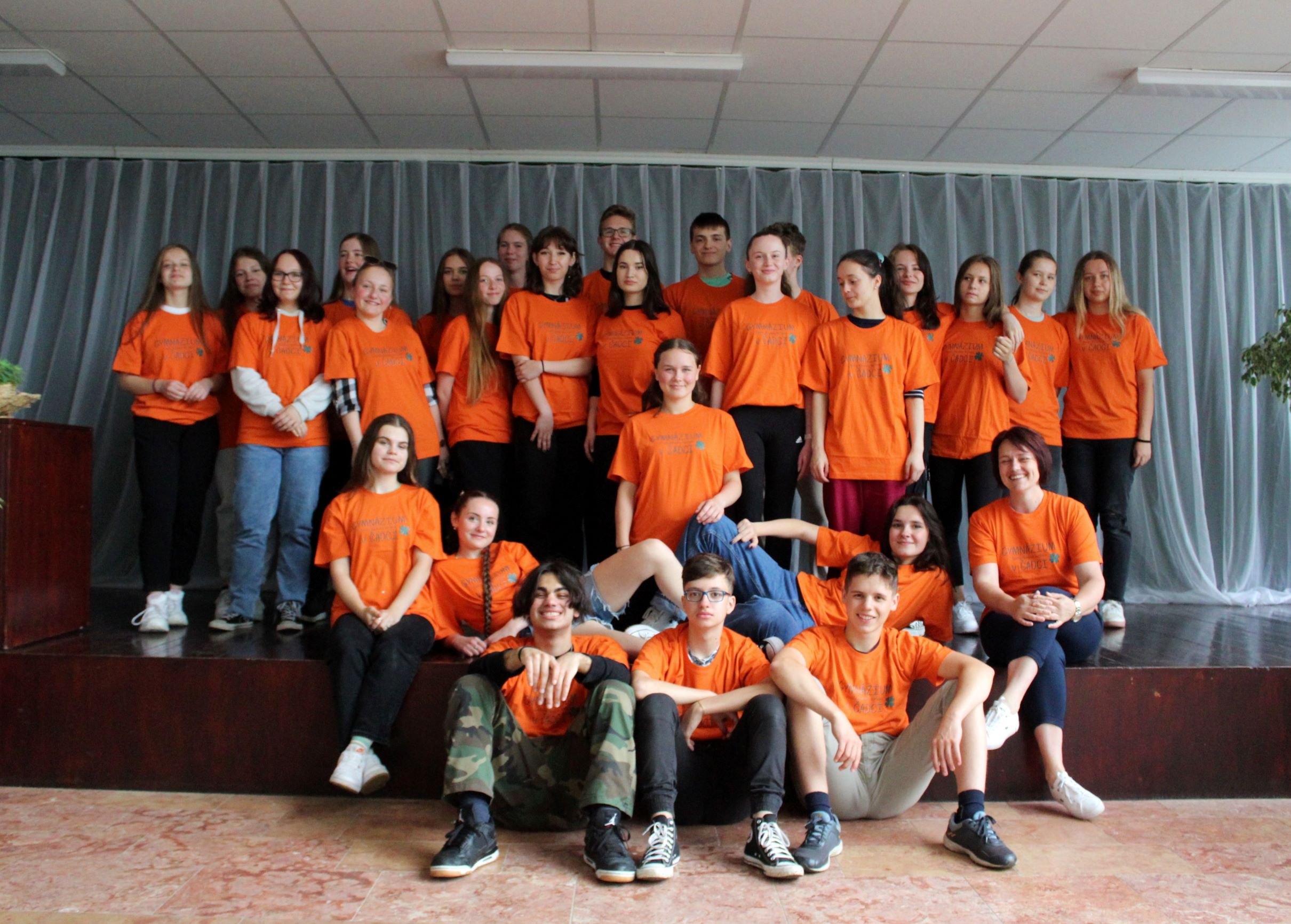 Každá jedna trieda na záver ako odmenu dostala gymnaziálne tričko z rúk pani riaditeľky Mgr. Ingrid Mikovčákovej. Spoločne triedy I. C, D, E, F, G vytvorili krásnu farebnú mozaiku.